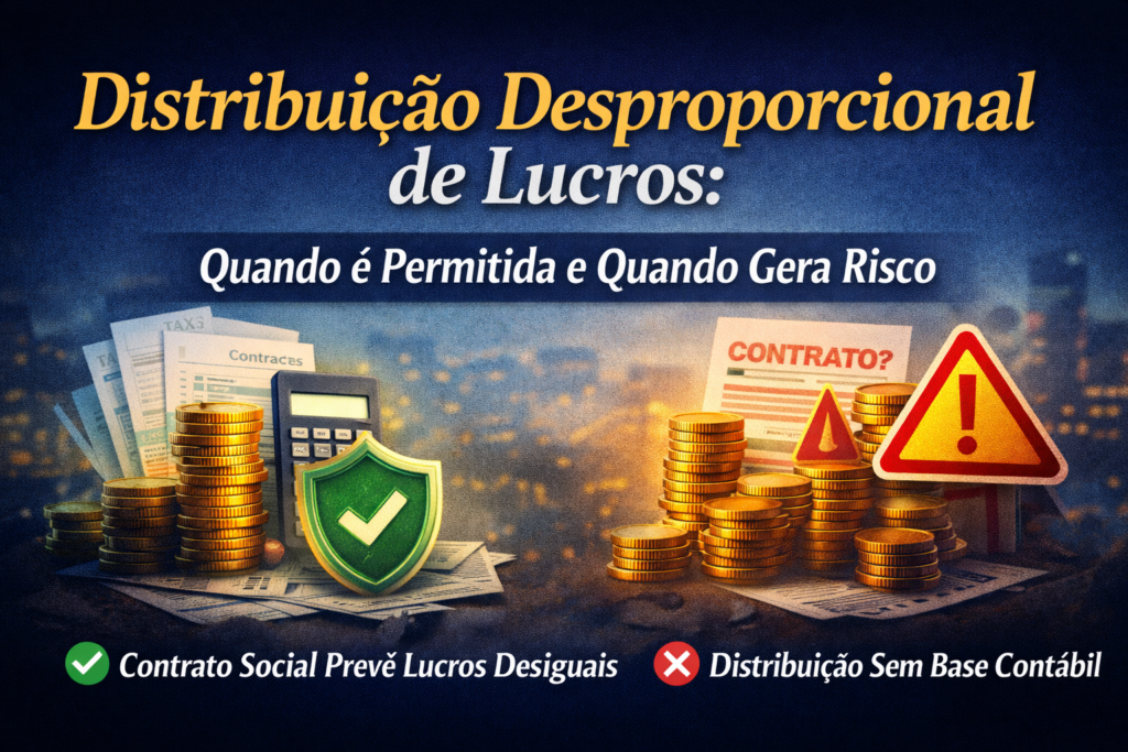 O que é distribuição desproporcional É a divisão de lucros entre sócios em percentuais diferentes da participação societária, desde que prevista em contrato. Quando é permitida Quando vira problema Riscos fiscais Conclusão Distribuição desproporcional é legal, mas exige contabilidade bem feita e contrato ajustado. Sem isso, vira passivo oculto.